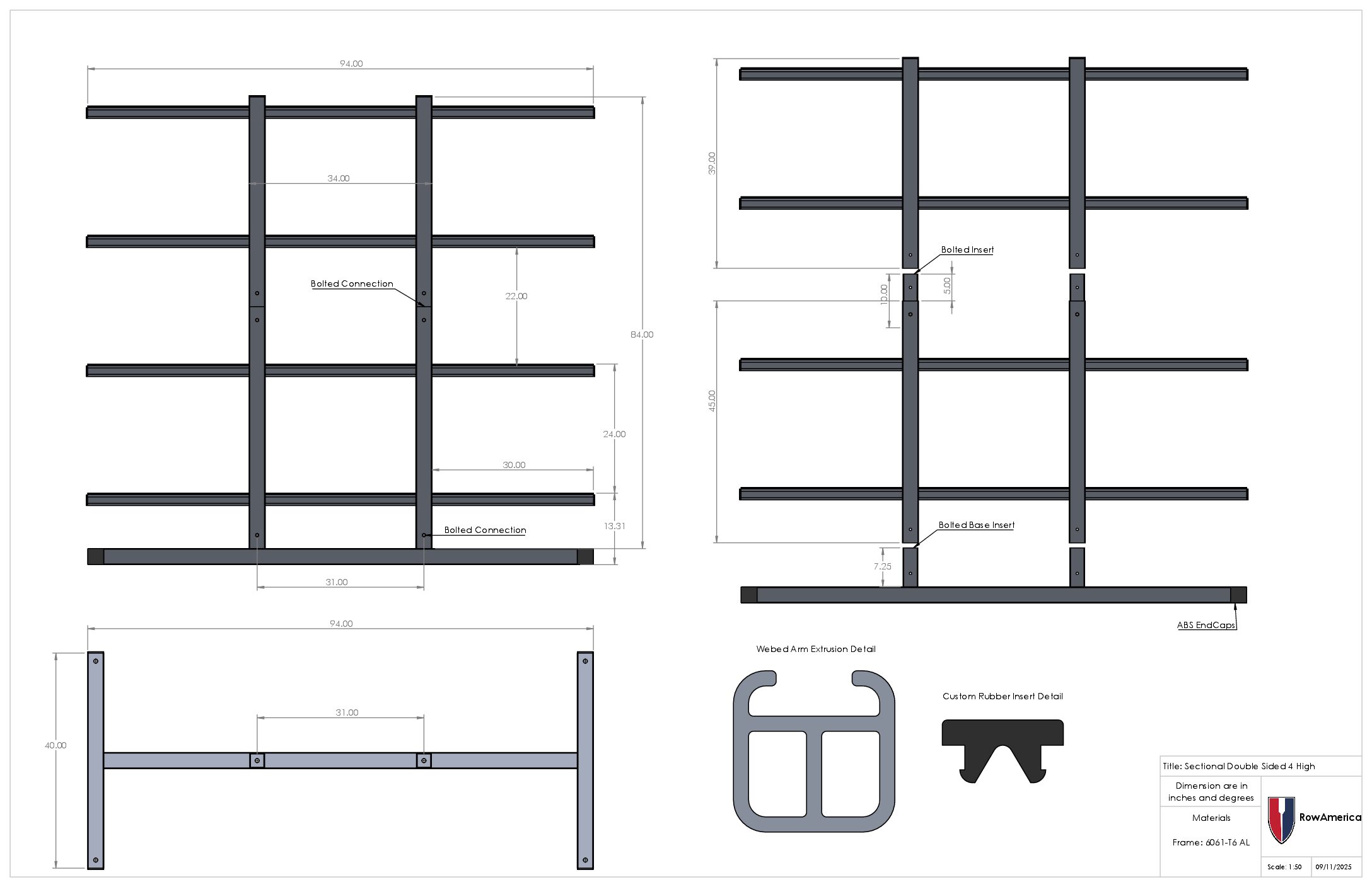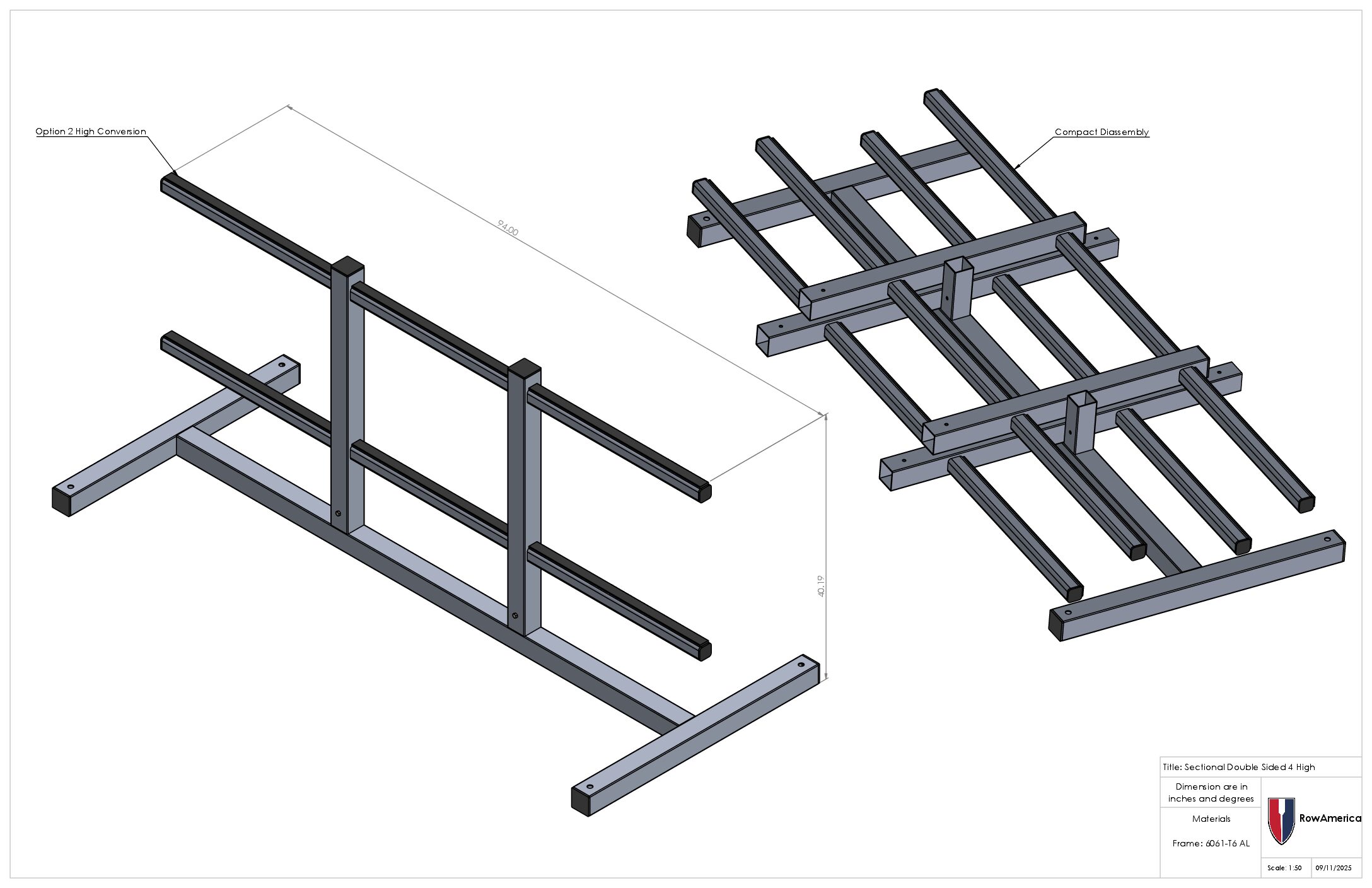 Ideal for both indoor and outdoor use, our boat racks help teams optimize their boatyard space. Our racks are made of of aircraft grade aluminum, double hollow extrusions when needed (aluminum extrusions as strong as steel) and are offered in bare aluminum or custom color powder coated finishes.